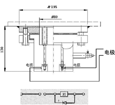1、電極裝置安裝于油箱底部,開口尺寸φ80,信號裝置安裝在便于觀察使用地方,二者間宜用屏蔽電纜連接并在一點接地。裝于油箱底板的電極裝置有4個電極,可分別并聯(lián)使用其中兩個。