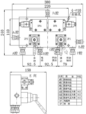 1、自動(dòng)回路:將手動(dòng)轉(zhuǎn)閥ZF1的手柄扳到停止位置,手動(dòng)轉(zhuǎn)閥ZF2的手柄扳到電動(dòng)位置,壓縮空氣進(jìn)入電磁換向閥DFA、DFB的壓力腔(進(jìn)氣腔),并密封在壓力腔內(nèi),左、右工作腔與排氣腔接通。