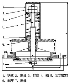 用螺絲刀旋開序號5的兩個(gè)緊定螺釘,拆開序號1護(hù)罩,按開啟真空度要求,固定序號4軸,松開序號2螺母,調(diào)整好擋塊,調(diào)完畢并緊定序號2螺母,蓋上序號1護(hù)罩,鎖緊序號5的兩個(gè)緊定螺釘。彈簧作用力在真空為5-10KPa時(shí)即能打開,當(dāng)真空值超過20-30KPa時(shí)閥門全開,當(dāng)閥門下部有水,靠水的浮力自動(dòng)關(guān)閉。