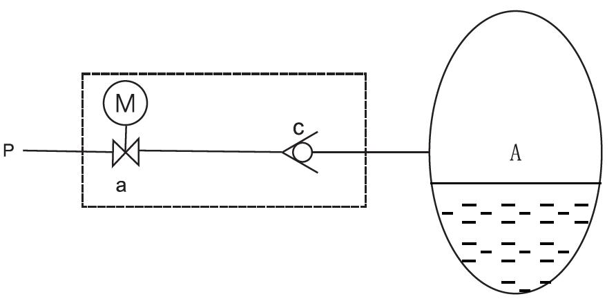 簡易型自動補(bǔ)氣裝置:工作原理如下圖所示,當(dāng)自動補(bǔ)氣條件滿足時,電動球閥得令通電,高壓氣通過電動球閥a、單向閥c補(bǔ)氣。此時閥位指向開啟位置,同時位置開關(guān)輸出補(bǔ)氣信號。建議采用PLC間歇補(bǔ)氣,防止補(bǔ)氣過量。電動球閥帶手動裝置,失電時可實(shí)現(xiàn)手動操作。