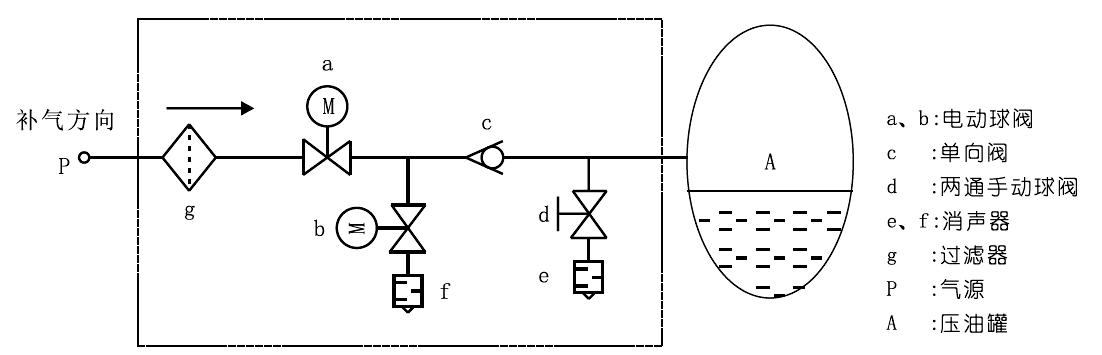 自動補(bǔ)氣:當(dāng)自動補(bǔ)氣條件滿足時,關(guān)閉電動球閥b,打開電動球閥a,補(bǔ)氣過程:高壓氣氣源P→過濾器g→單向閥c→壓油灌A補(bǔ)氣。
